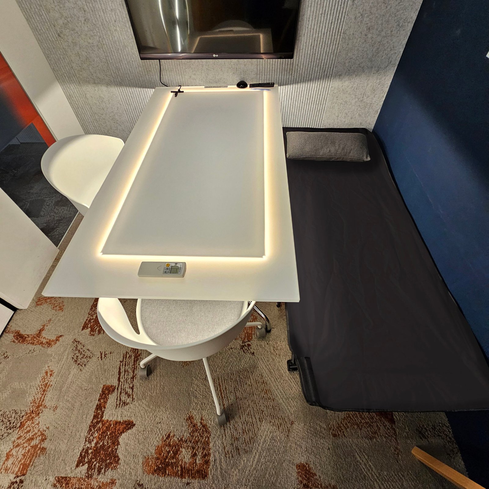 A single folding bed with disposable pillowcase is provided for a nap when needed